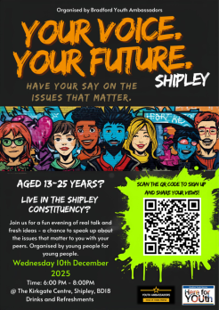 If you are aged 13-25yrs and live in the Shipley constituency, then come down to KCC on Wednesday 10th December at 6.00pm to join an evening of real talk, fresh ideas and an open discussion with other young people. The aim being to enable you to share your views and help shape the future of your community.